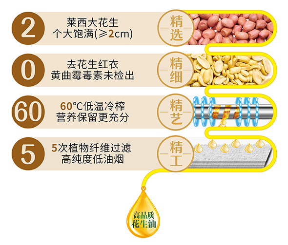 全程低溫處理,花生細(xì)胞結(jié)構(gòu)保留完好,雜質(zhì)少,不易產(chǎn)生油煙。